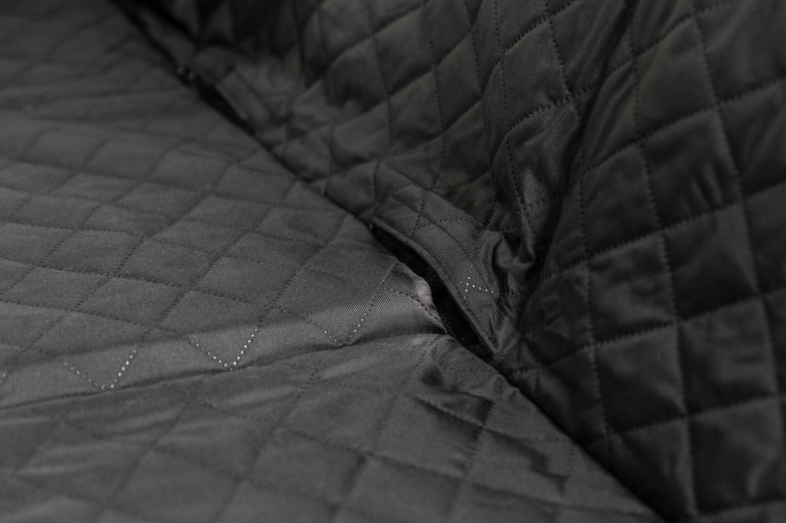 - Seitenteile können zum Ein- und Aussteigen durch zwei Reißverschlüsse heruntergeklappt werden und schützen so Polster und Verkleidungen