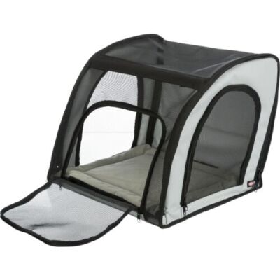seitlich und von vorne zu öffnen mit Befestigungsgurten zur Fixierung des Sitzes im Fahrzeug Gurtdurchführung zum Anschnallen des Hundes diverse Netzeinsätze herausnehmbares Kissen mit Schaumstoff- Füllung: Handwäsche zusammenklappbar Polyester