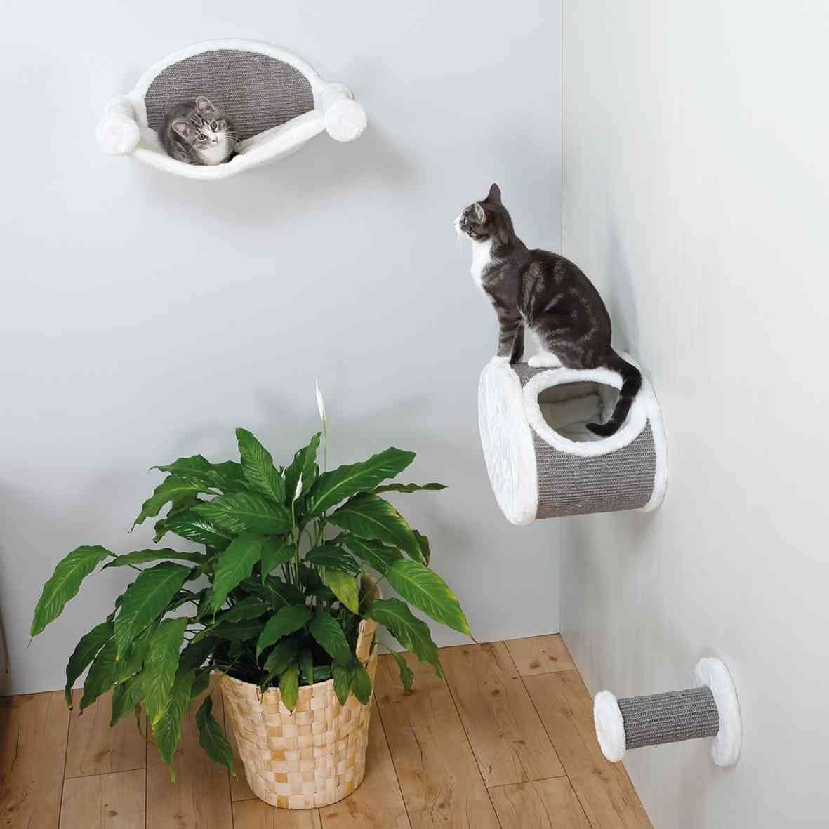 Trixie Kuschelhöhle zur Wandmontage Beschreibung: mit Plüsch- Bezug ( Polyester) und Sisalkratzfläche auch zur Ergänzung bereits vorhandener Kratzmöbel geeignet Höhle komplett mit Plüsch ausgestattet, mit Wendekissen ( Polyester) Wendekissen: Handwäsche plüschbezogene Rückseite ( Polyester) Farbe: weiß/grau Kuschelhöhle zur Wandmontage Maße: 42 × 29 × 28 cm Grundfläche: 42 × 28 cm Höhe: 29 cm Farbe: weiß/grau Kletterstufe zur Wandmontage Beschreibung: mit Plüsch- Bezug ( Polyester) und Sisalkratzfläche auch zur Ergänzung bereits vorhandener Kratzmöbel geeignet plüschbezogene Rückseite ( Polyester) Farbe: weiß/grau Kletterstufe zur Wandmontage Maße: ø 18 × 22 cm Farbe: weiß/grau Hängematte zur Wandmontage Besc