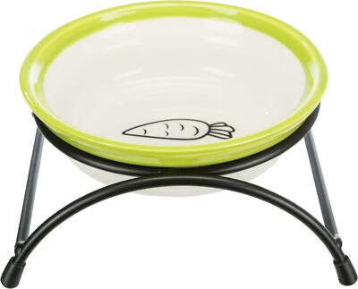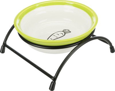 Keramiknapf mit Halter 60749 schützt Futter vor Kot und Urin Metallhalter, pulverbeschichtet, schwarz rutschfest durch Gummifüße Keramiknapf mit Halter Maße: 0,3 l/ø 13 cm Farbe: weiß/grünfür: Kaninchen
