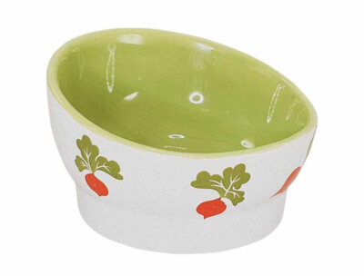 Dieser dekorative, ergonomisch geformte Keramik Napf "Radish" ist innen gruen und von außen mit aufgedruckten Radischen versehen. Die hellen Farben des Napfes werden Ihr Nagerheim farblich auffrischen. Dieser Napf ist in zwei verschiedenen Groeßen erhaeltlich.