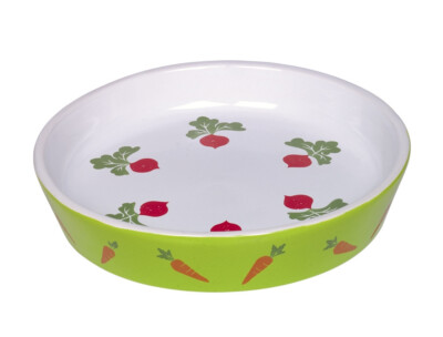 Diese dekorative Keramik Schale fuer Nager passt mit seinen aufgedruckten Moehren und Radieschen garantiert in jedes Nagerheim.