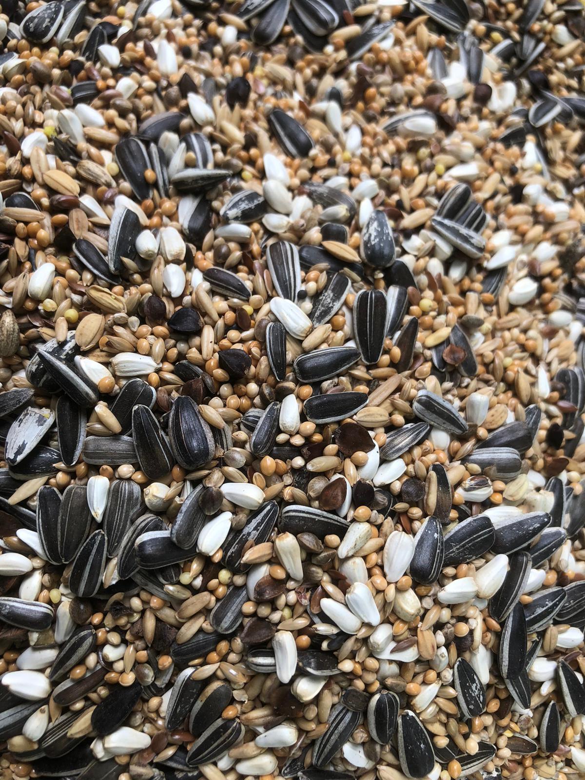 Plata Hirse 20%, Gestreifte Sonnenblumen 15%, Silberhirse 13%, Kanariensaat 12%, Weiße Sonnenblumen 8%, Cardy 7%, Haferkerne 7%, Buchweizen 5%, Hanfsaat 3%, Paddy Reis 3%, Japan Hirse 3%, Leinsamen 3%, Negersaat 1%