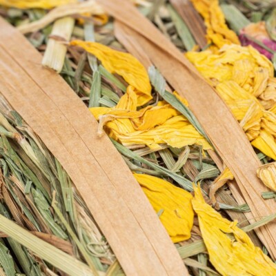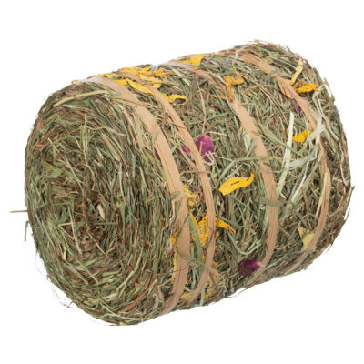 Produktbeschreibung Heurolle für Nager mit Blüten mit Zelluloseband umwickelt für: Kaninchen, Kleinnager Inhalt: 500 g