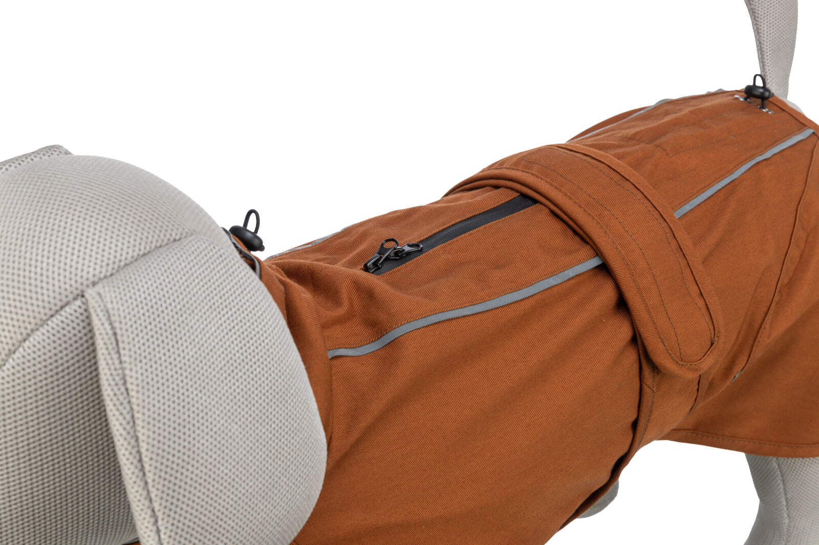 - mit wasserdichtem Reißverschluss zum Anleinen am Geschirr
