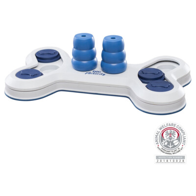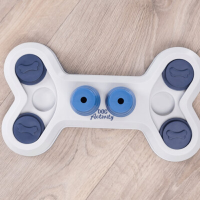Der „Flip Bone" ist ein Strategiespiel in Knochenform für Hunde. Das Spielbrett enthält an beiden Außenseiten Vertiefungen und Schiebedeckel, in der Mitte gibt es zwei Kegel. Du kannst die Vertiefungen mit Snacks deiner Wahl oder dem Trockenfutter deines Vierbeiners befüllen, die er anschließend mit den Pfoten oder der Schnauze herausholen soll.