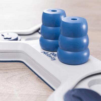 Um den Schwierigkeitsgrad zu erhöhen, kannst du die Kegel zwischen die Abdeckungen setzen und auch hier jeweils ein Leckerli verstecken. Dein Hund muss nun verstehen, dass er erst die Kegel entfernen muss, bevor er die Abdeckungen verschieben kann. Das Activity-Spiel ist spülmaschinenfest.