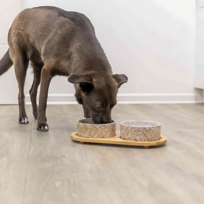 Produktbeschreibung Napf- Set für Hundebestehend aus 2 Näpfen und Halterrutschfest durch Gummifüße Material: Keramik / Bambus Inhalt: 2x 300 ml Maße: 30 x 6 x 15 cm / Näpfe: ø 12 cm Farbe:weiß-hellbraun/hellbraun