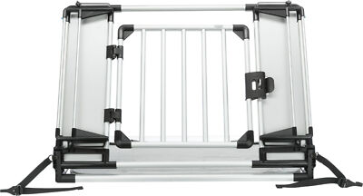 macht den Kofferraum zur Hundebox zur Platzierung hinter der Heckklappe für fast alle Fahrzeugtypen geeignet Breite stufenlos anpassbar durch verstellbare Seitenteile verstellbare Winkelung des Gitters Nutzung des gesamten Kofferraumes als Liegefläche einfaches Einklappen zur Nutzung des Kofferraumes zur Überwindung der Ladekante Tür in zwei Höhen montierbar mit Vorrichtung zur Anbringung eines Vorhängeschlosses mit rutschfester Liegematte: Maschinenwäsche bis 30 ° C Bodenplatte mit Klettfüßen inkl. 4 Fixier- Haken Höhenerweiterung separat erhältlich ( Artikel 13202) Aluminium/ Hartfaserplatten/ Kunststoff