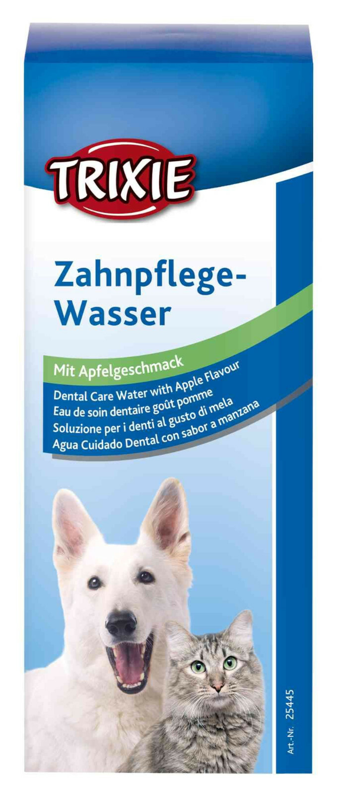 Ein frischer Atem und eine gesunde Maulhygiene sind wichtig - für Hunde sowie für Katzen. Trixie Zahnpflege-Wasser mit Apfelaroma kann einfach in das Trinkwasser deines Vierbeiners gegeben werden. So werden die Zähne und das Maul deiner Fellnase beim täglichen Trinken gepflegt. Das Zahnpflegewasser beugt schädlichen Bakterien im Maul vor und sorgt somit für eine bessere Maulhygiene. Das frische Apfelaroma sorgt zusätzlich für einen angenehmen Atem.