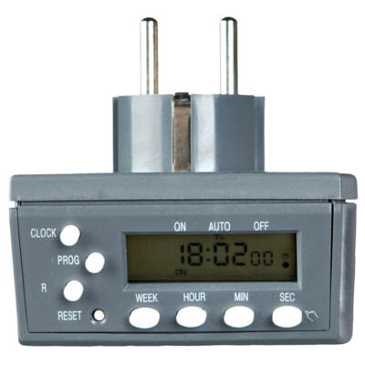 Zeitschaltuhr, digital für Terrarien mit Sekundenfunktion bis zu 8 Ein-/ Ausschaltzeiten einstellbar kürzeste Schaltzeit 1 Sekunde Schaltung täglich, an bestimmten Tagen, in Blöcken, am Wochenende oder - werktags möglich Akku verhindert Datenverlust bei Stromausfall mit integrierter Kindersicherung auch für Aquarien geeignet maximale ohmsche Last: 16 A maximale induktive Last: 3 A