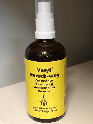 " Geruch-weg Vetyl"ist ein anwendungsfertiges Sprühmittel zur raschen Beseitigung jedweder Gerüche in Haus, Hof, Stall und Zwinger; gegen unangenehme Gerüche von Tieren aber auchvon Mülltonnen, Windeleimern, Containern etc. Anwendung: Entsprechende Stellen je nach gewünschter Intensität einsprühen! Die Mülltonnen beim Befüllen lagenweise einsprühen! Vorsichtsmaßnahmen: Nur zur Anwendung nach Gebrauchsanweisung. Bei sachgemäßer Anwendung unschädlich für Mensch und Tier. Entzündlich! Nur völlig entleert fortwerfen! Bei der Anwendung nicht rauchen. Behälter dicht verschlossen halten. Vor Kindern sichern!